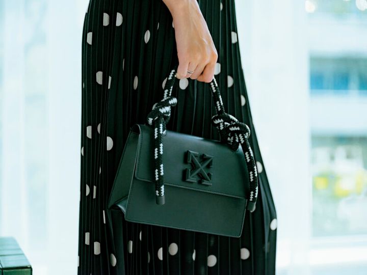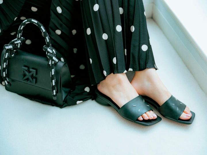 「ワンピースはパリのブランド『セザンヌ』。上品な露出感とプリーツのラインが、すっきりと華奢見えに貢献。ストリートとモード感のある『オフホワイト』のバッグと『メゾン マルジェラ』のサンダルを足して全体をピリッと引き締めました。サンダルはシンプルなのでどんなテイストの服にも大活躍しています。ブレスレットは『アミ パリス』。華奢でシンプルながら、ロゴのアクセントが可愛くてお気に入りです」