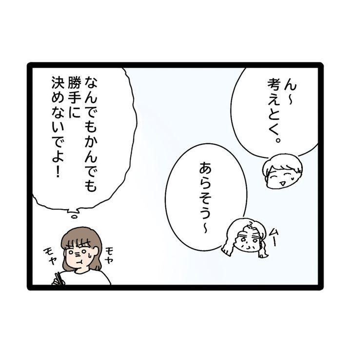 「ん~考えとく」と言葉を濁したひできに、「あらそう~」と少しムッとしたような義母、二人のやりとりを見て、「なんでもかんでも勝手に決めないでよ!」とモヤモヤしながらハンバーグを食べたのでした。