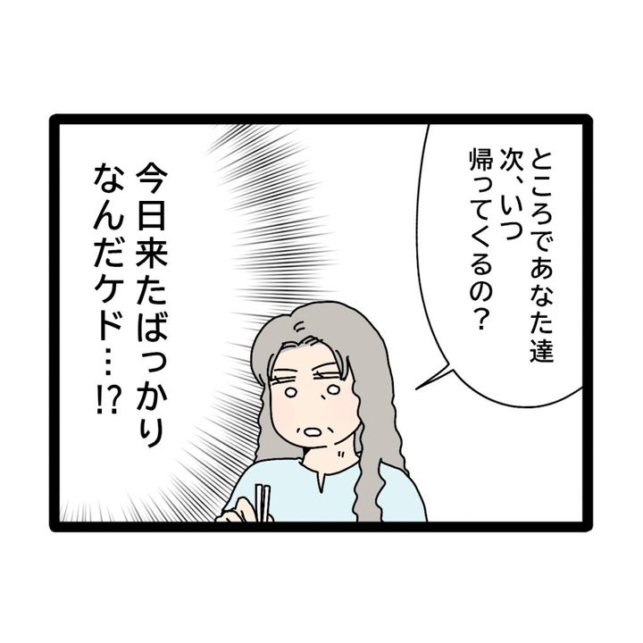 「ところで、あなた達、次いつ帰ってくるの?」と義母に言われ、「今日来たばっかりなんだケド・・!?」と頭の中は?でいっぱいに。