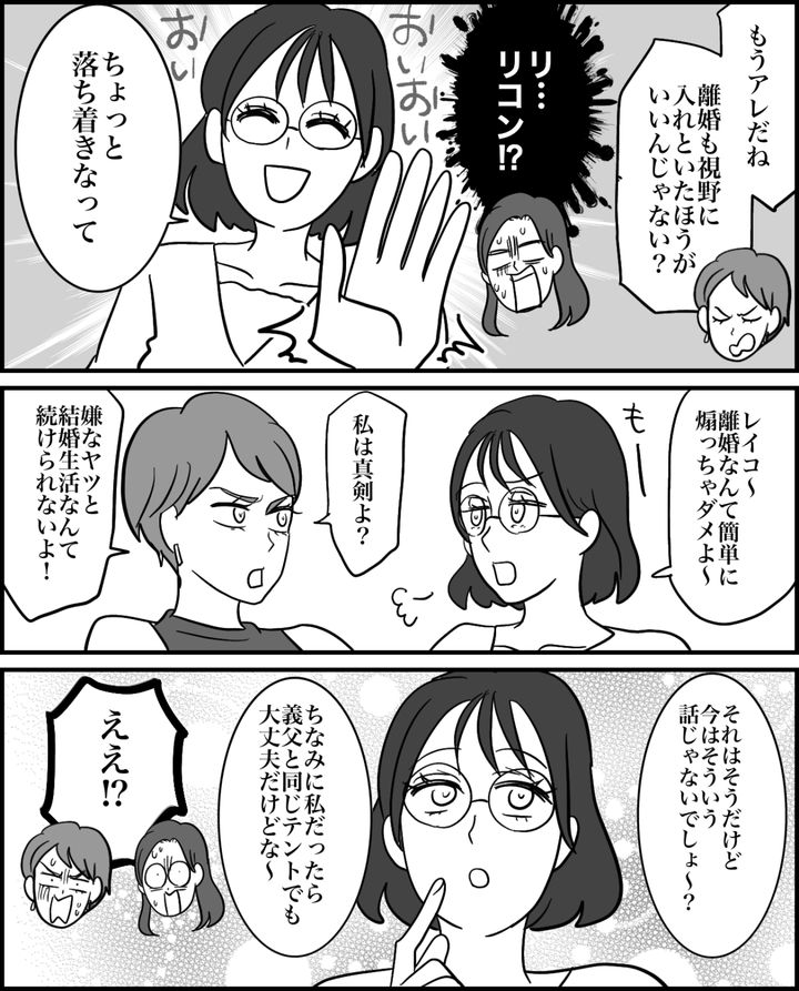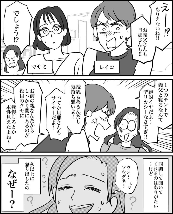 レイコに同調してもらえて最初は嬉しかったです。ただ義父とは今まで良い関係を保ってこられたし、今回のことで離婚まで考えるのはあまりに飛躍しすぎです。一方で穏やかなマサミは「自分だったら同じテントでも大丈夫」と言いました。