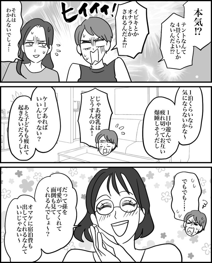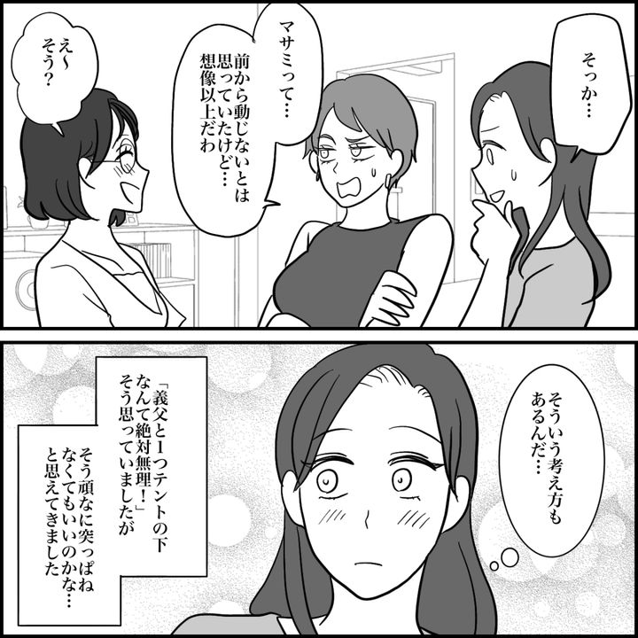 <絶対イヤ!義父と同じテント>あからさまに嫌がりすぎた…?友人の意見に思い直す私【まんが】