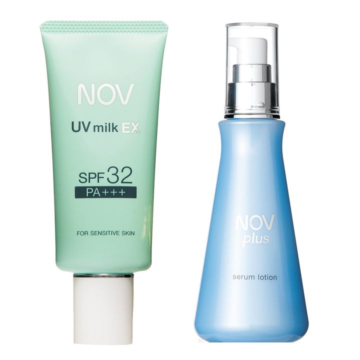 左:「ノブしか使えない」という声も多く、化粧品がなかなか肌に合わない…という人も安心してケアできるのが魅力。人気はお湯で落とせるミルクタイプの日焼け止め。紫外線から守るだけでなく、日焼け止めそのものが肌負担にならない設計で敏感肌にも安心。ノブ UVミルクEX 35g ¥2,200 右:2024年に誕生した高機能スキンケアライン。ノブプラス セラムローション 150ml ¥4,950
