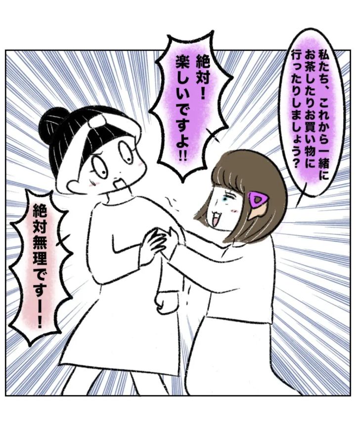 友達になれないとハッキリ言われたにもかかわらず、臆することなく「私たち、これから一緒にお茶したりお買い物に行ったりしましょう?絶対!楽しいですよ!!」と言ってくるゆかちゃんママに「絶対無理ですー!」と伝え続けるまるさん。
