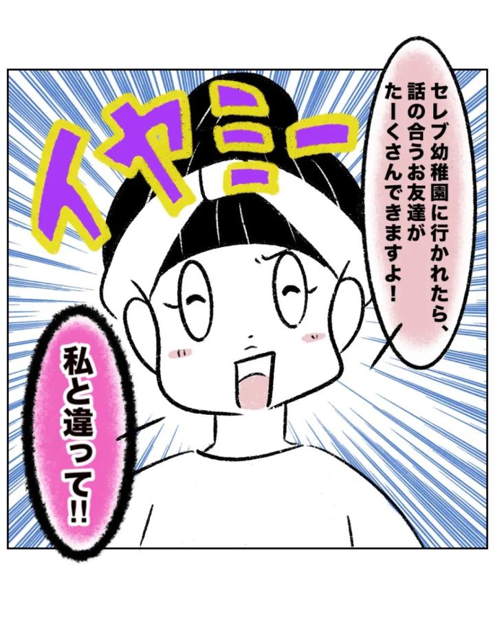 そして、思い切り嫌味を込めて、「セレブ幼稚園に行かれたら、気の合うお友達がたーくさんできますよ!私と違って!!」と笑顔で言い放ちました。
