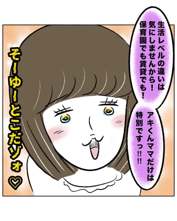 ゆかちゃんママは急にほほ笑んで「生活レベルの違いは気にしませんから!保育園でも賃貸でも!アキくんママだけは特別ですっ!」と、上から目線で嫌なことを悪びれずに言いました。