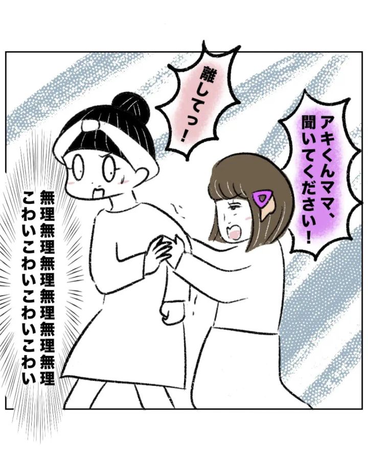 とにかくゆかちゃんママから離れたいまるさんに必死にしがみついて離さないユカちゃんママを振り解こうとまるさんも必死です。「離してっ!」と言いながらも、心の中では「無理、こわい」が繰り返されていました。
