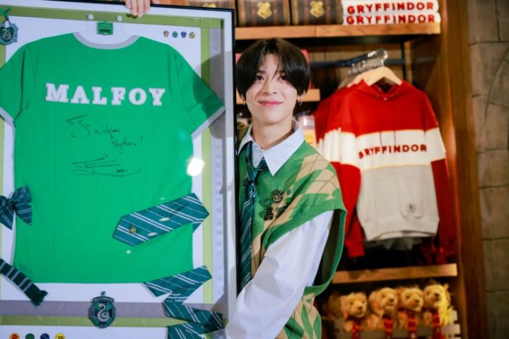 グリーンを基調にしたこだわりのコーディネートについて「推しの“スリザリン”の要素を僕の私服のテイストに取り入れてみました。胸元のバッジは自前です!」と自らのスタイリングについても紹介してくれました。完璧な装いで憧れの存在であるトム氏と劇的な再会を果たし、終始笑顔だった松島さん。溢れんばかりのマルフォイ愛を熱く語ってくれました!