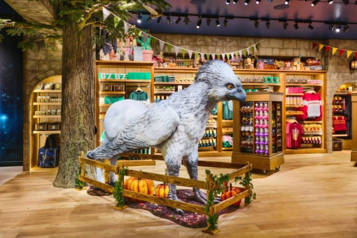 店舗総面積は約900平方メートル、2フロア構成になっていて、作中でも登場する「禁じられた森」をテーマにした内装は、誰もが映画の世界へと没入できる空間です。魔法動物のバックビークやフクロウたちがお出迎えしてくれるのも、ハリポタファンにはたまりません!