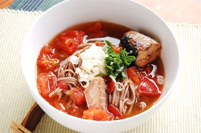 やさしい塩味で、旨味たっぷり。トマトの甘味と爽やかさもあります。そばつゆにはサバの旨味はあるものの、臭みはなし。