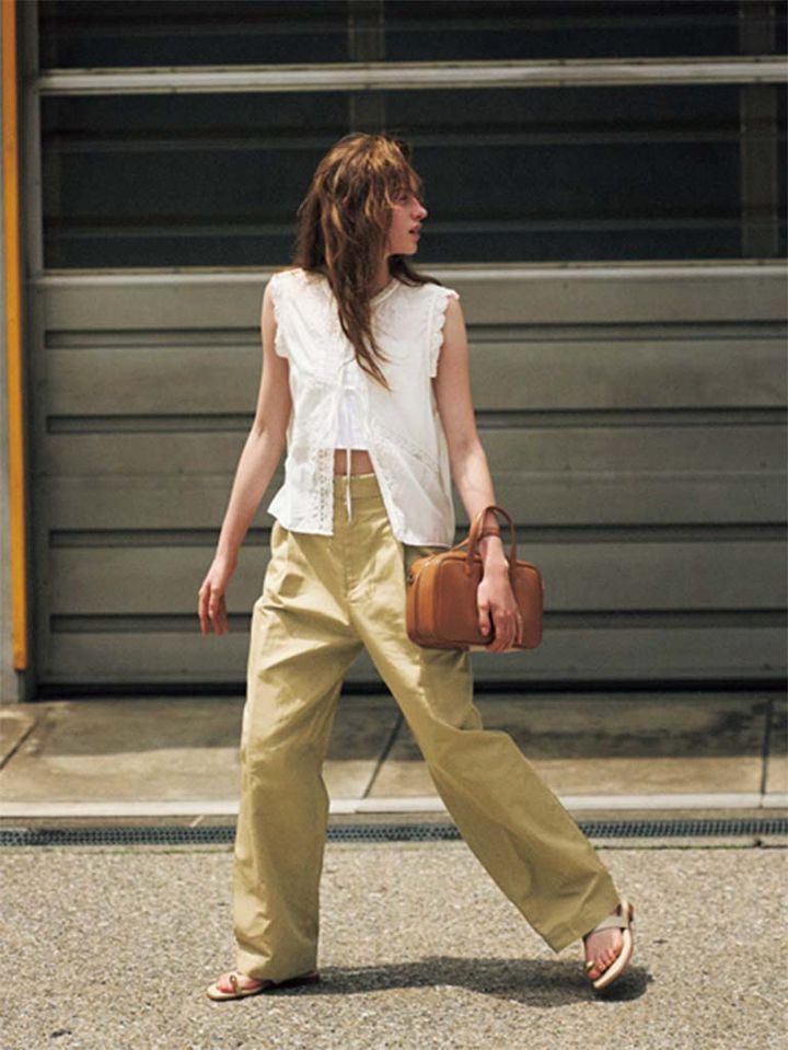 【POINT】やわらかくもフェミニンなイメージを抱く白+ベージュ配色を、チノにあてはめると? 白レースのブラウスと組み合わせても、膨張することなく糖度もひかえめに。