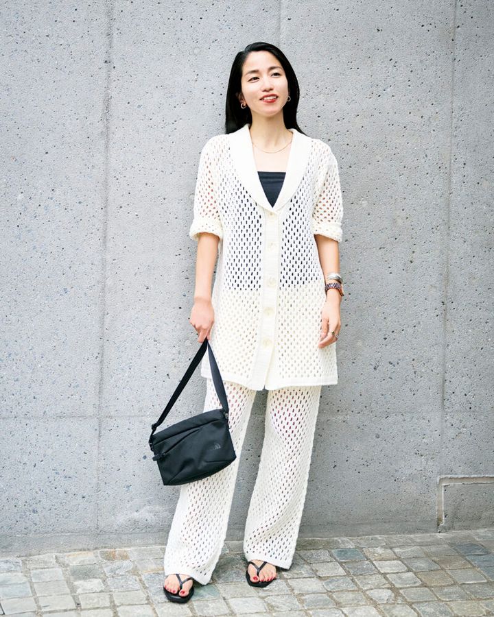 「白のメッシュニットのセットアップには、インナーや小物を黒で統一しメリハリを効かせることでリラックスになりすぎず、ヘルシーな肌見せ印象に。インナーキャミは首元がすっきりと開いているので、襟付きのトップスにも好相性です」