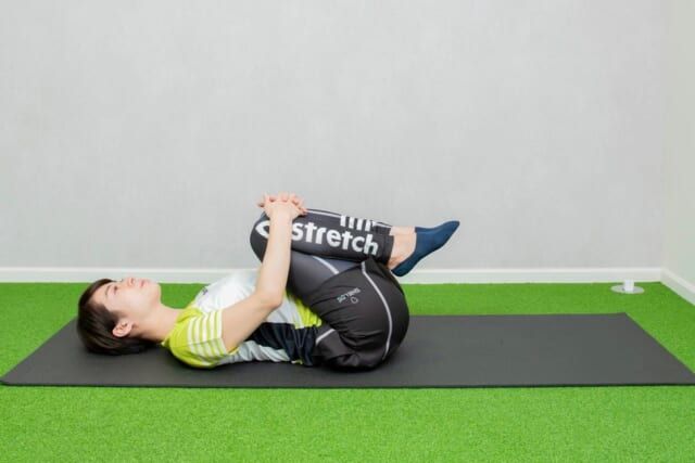 (3)息を吐きながら骨盤を胸に引き寄せて、5秒引き寄せたら、5秒かけてゆっくり戻していく