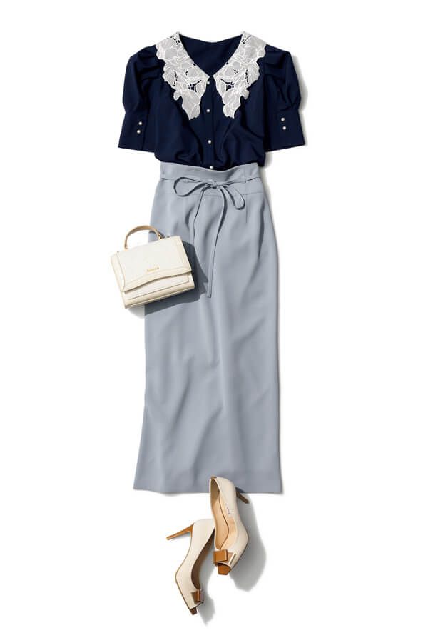 デコラティブな甘口トップスが主役の日は、オフィスコードに引き寄せるペンシルスカートが有効。トップスの甘さを抑えるIラインシルエットでお仕事場面での浮かれ見えを防止して♪