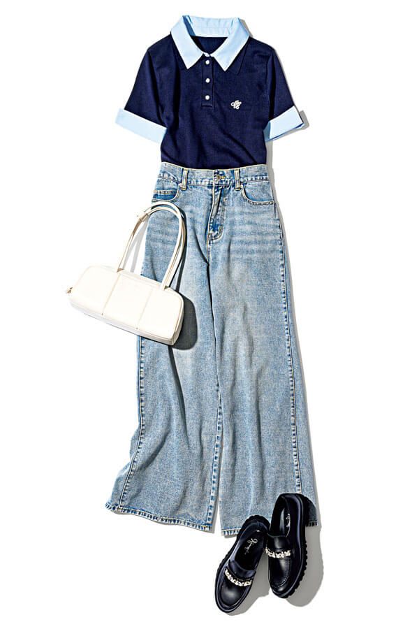 バイカラーのポロニットで、デニムをレディライクに更新。ハイライズとバギーが生み出すこなれ感でトップスを洗練させて。