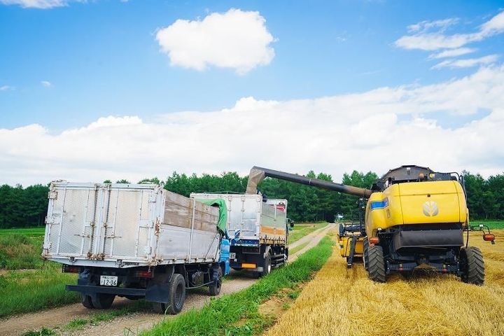 収穫された小麦がいっぱいになると、畑の外にトラックが待ち構えています。