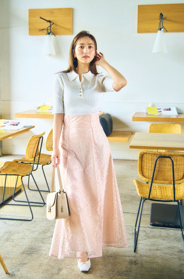 フェミニンスタイルに欠かせない、 総レースのスカート。今季トレンドのトラッド服をフェミニン寄せに着るのにも最適なんです。