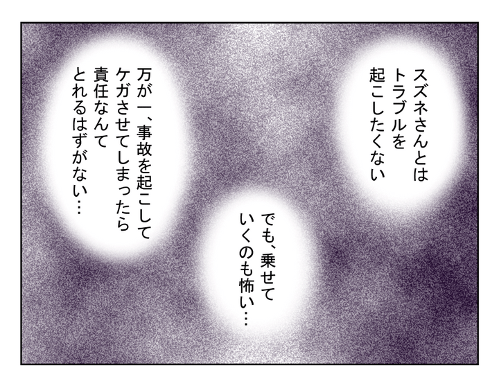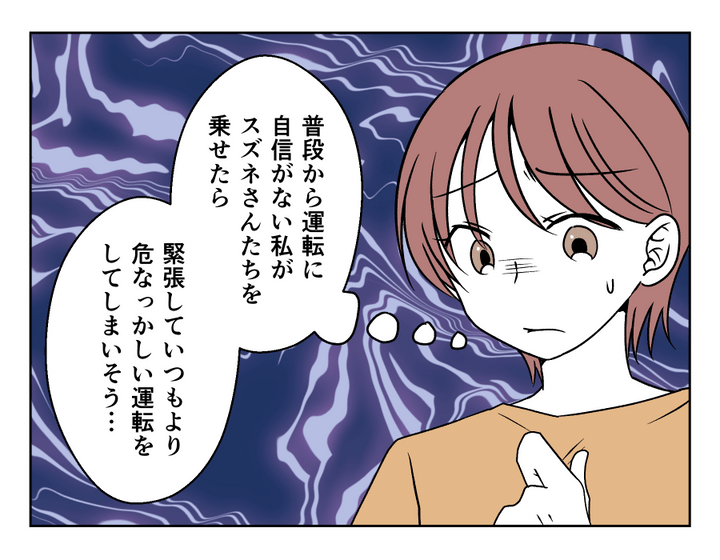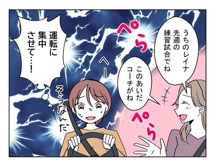 誰だって運転している最中は、運転に集中したいですよね。車に苦手意識のある人だったら、なおさらのことでしょう。なのに、ちょっと苦手なママ友が助手席に乗っていたら? しかも、ペラペラと絶えずしゃべりかけてきたら? 無視するわけにもいかないし、かといって何て返事をするか考えていると、運転をミスしてしまいそうですよね。やはり今回は、何を言われても断ろうと思うマイさんなのでした。