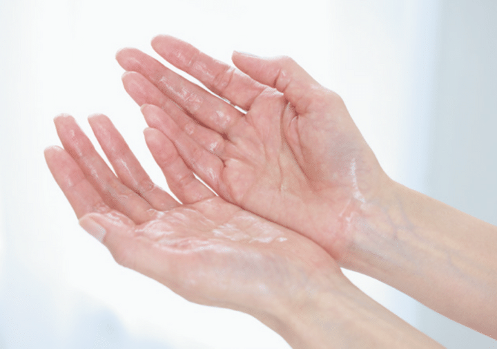 両手を合わせて、指先から手のひら全体に化粧水を広げるのがしっかりなじませるコツ。