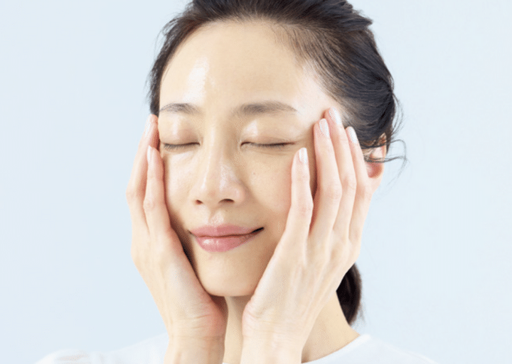 手のひら全体で顔を包み込むようにして、顔の広い面に化粧水をなじませていく。