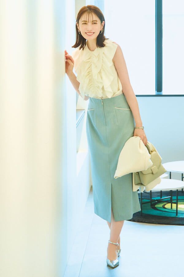 暑さが増して、トップスが軽くなると迷い出す通勤服選び。そんなお悩みは、どんなトップスともマッチして、レディに決まるペンシルスカートで即解決。甘口フリルブラウスを美人ルックに誘うブルーで清涼感も十分♡