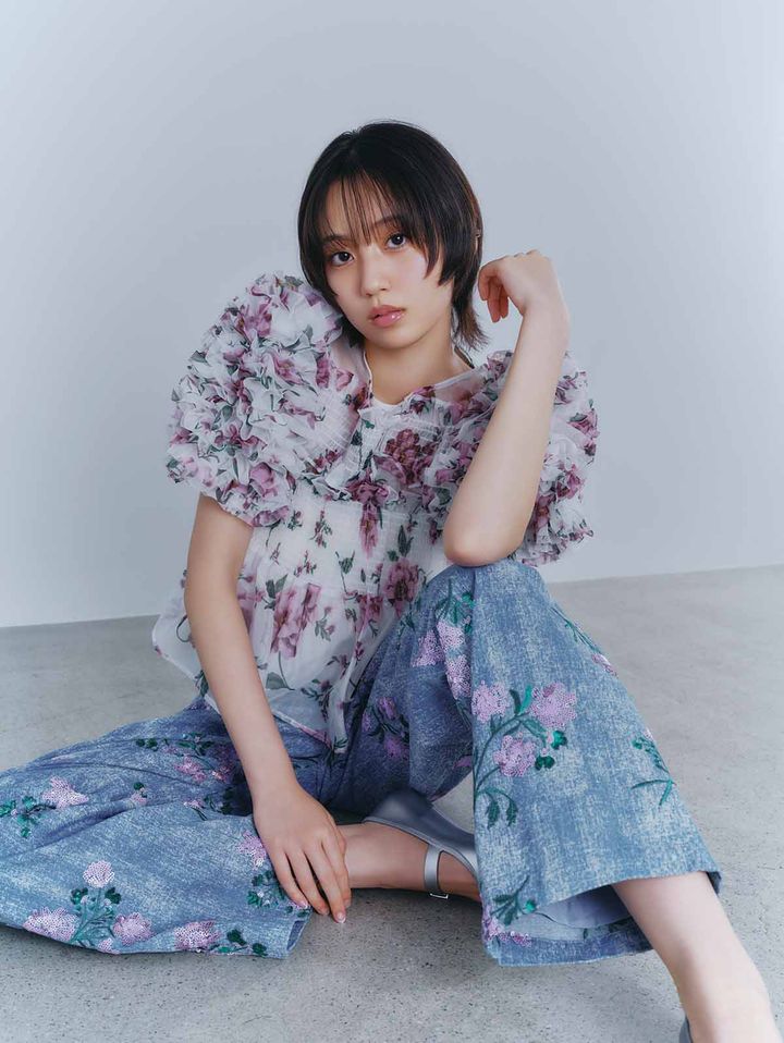花柄トップス ¥31,680、パンツ ¥39,380/ともにDREAM SISTER JANE(THE WALL SHOWROOM)、シューズ ¥13,200/MELISSA(Melissa Shoes Japan)