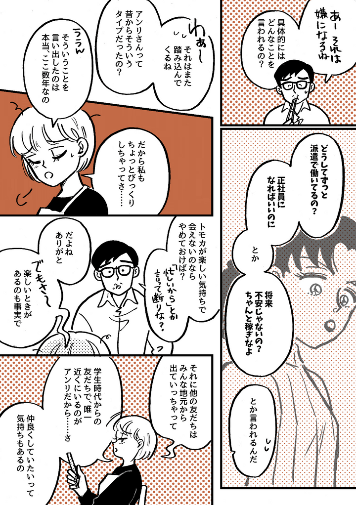 アンリには「どうしてずっと派遣で働いてるの? 正社員になればいいのに」とか、「将来不安じゃないの? ちゃんと稼ぎなよ」などというような結構踏み込んだことを指摘されるのです。いままではそんなことを言ってくるタイプではなかったので、私も戸惑っているのです。