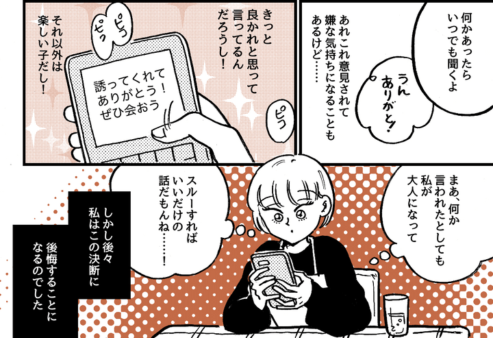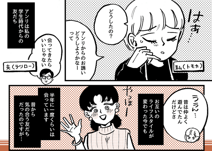 私はトモカ。夫と小3の息子の3人暮らしをしています。新卒で入った会社は、出産をきっかけに退職して、今は派遣社員として働いています。忙しいながらも幸せな生活を送っていますが、私には小さな悩みがひとつ……。それは学生時代からの友人アンリのことです。アンリはとても楽しい人ではあるのですが、最近私に意見するような発言が増えてきました。今では会うたびになんだか落ち込んでしまいます。どうしたらいいのでしょうか。