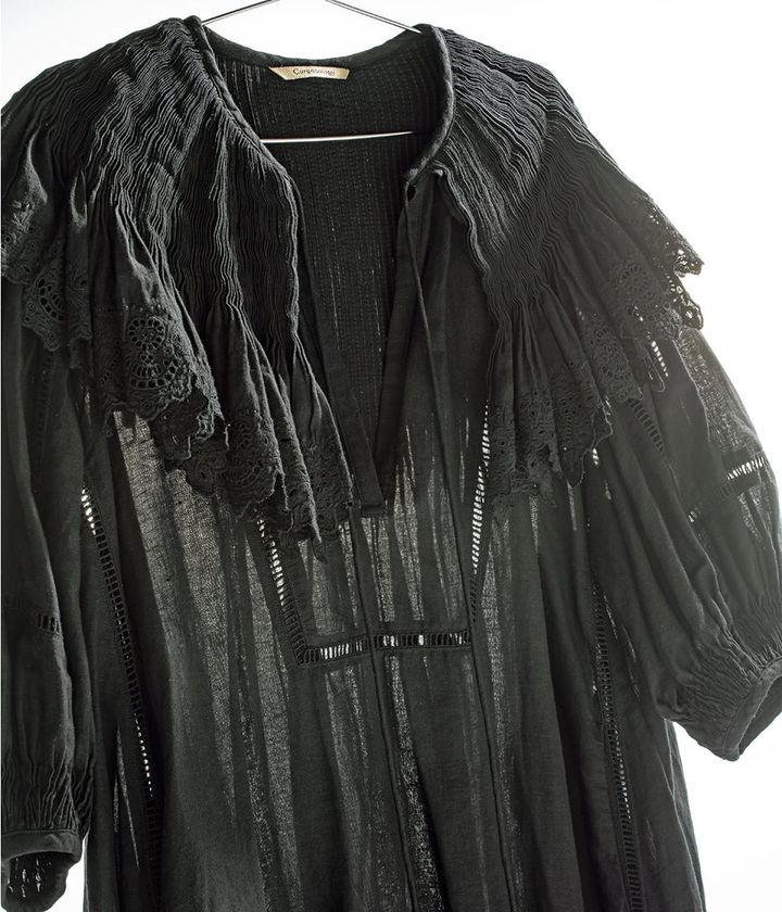衿のエンブロイダリーレースやライン状に入ったハシゴレースが上品な透け感。リネンコットン素材にレースが施されたワンピースはフレンチシックなムードが漂います。レース部分だけのちょっぴり肌見せは、露出面積は少なめだけど着映え効果抜群! 大胆な肌見せには抵抗があるけれど夜のお出掛け気分を盛り上げたい人にもおすすめ。