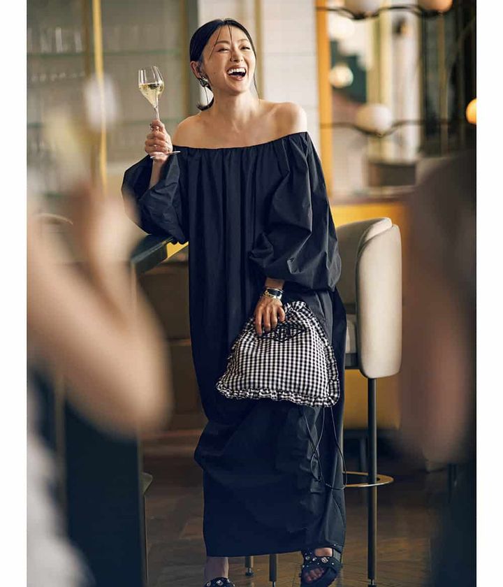 ダイナミックな華やかさで大優勝♡ 胸元の一番スリムな部分を見せつつ気になる二の腕をカバーしてくれる長袖のオフショルダーは、体型カバー力で右に出るものなし。デコルテを大胆に出すことで首が長くすっきり見え、ドレスアップ感も高まります。黒の面積が広いのでカジュアルなチェックの巾着バッグやビジューが輝くサンダルで軽やかさを演出したい。