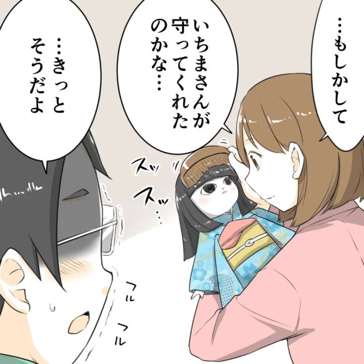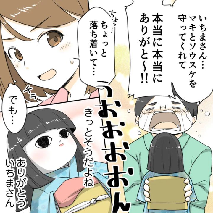 園田家に代々伝わり床の間に飾られている市松人形のいちまさんは、みんなに大切にされていました。ある夏祭りの日のこと。妻マキさんと息子ソウスケくんは床の間のいちまさんと一緒にお留守番することに。すると、「いちまちゃんにあげるりんご飴もあるよ!」と嬉しそうにりんご飴を差し出すユカちゃんを見て、「やっぱり・・」と思わず笑顔に。その後ユカちゃんたちの盆踊りを見ていると、ソウスケくんが泣き出し、お腹が空いたのかと急いで家に帰ることに。家に到着すると、なぜか玄関の扉が開いていて、そっと近づくと何やら男性の話し声が。ソウスケくんの泣き声に気づいた男性が近づいてきて絶対絶命!大きな叫び声をあげて男性が家から逃げて行くのが見え、「泥棒入ったかも」とマサルさんに伝えると、すぐに警察官と一緒に戻って来ました。祭りの時間を狙った空き巣かもと言われ「鉢合わせするとこだった」と力が抜けるマキさん。その後、現場検証があり、盗られたものはなさそうだということが判明。疲れ切って眠ろうとした時、逃げ出した男2人の様子から「何かに怯えて・・」と言いながら、ハッと思い当たったマキさんは、マサルさんと一緒にいちまさんの様子を見に行くことにしたのでした。