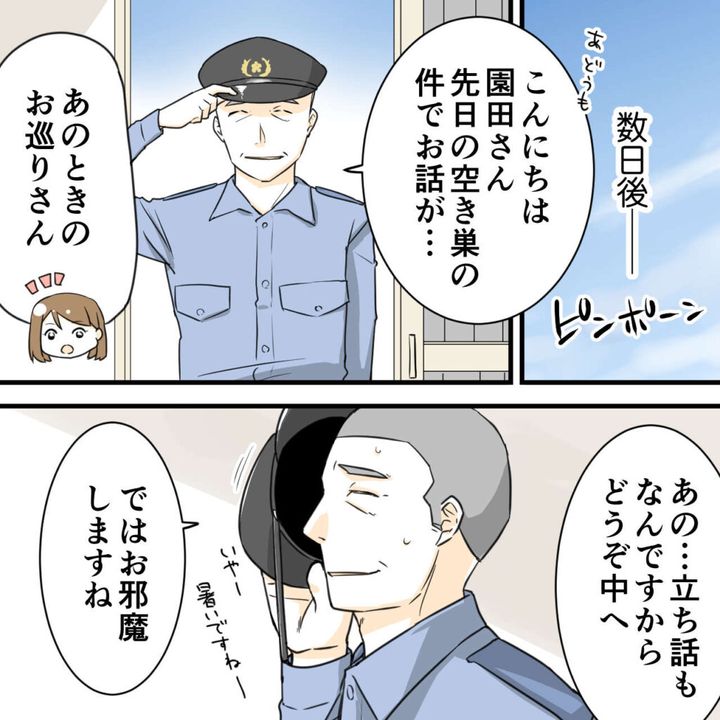 「あ、どうもこんにちは園田さん。先日の空き巣の件でお話が・・」と玄関先「あのときのおまわりさん」が。「あの・・立ち話もなんですから、どうぞ中へ」と案内すると、「ではお邪魔しますね」とおまわりさんが答えて家の中へ。