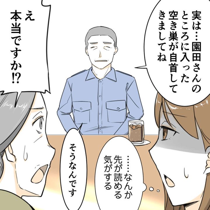 そして、「実は・・園田さんのところに入った空き巣が自首してきましてね」おまわりさんの言葉に「え、本当ですか!?」と驚くお母さんを見ながら、「・・なんか先が読める気がする」と呟く私。「そうなんです」とおまわりさん。