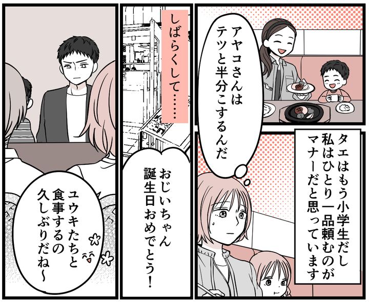 外食のときはタエが残す前提で、タエの好きなものを注文しています。