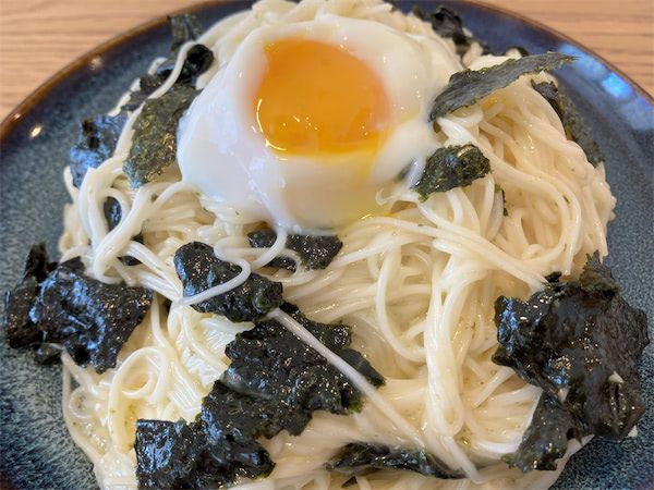 そうめんにマヨネーズと卵が絡むことで、なんだかクリーミーなソースを混ぜ合わせたような食感に!そのおかげで、白だしの塩味が全体にうまく馴染んでいます。のりの香ばしさもいい感じ。上の温泉卵と混ぜ合わせることで、よりマイルドなお味に。卵かけご飯に近い味かも…?