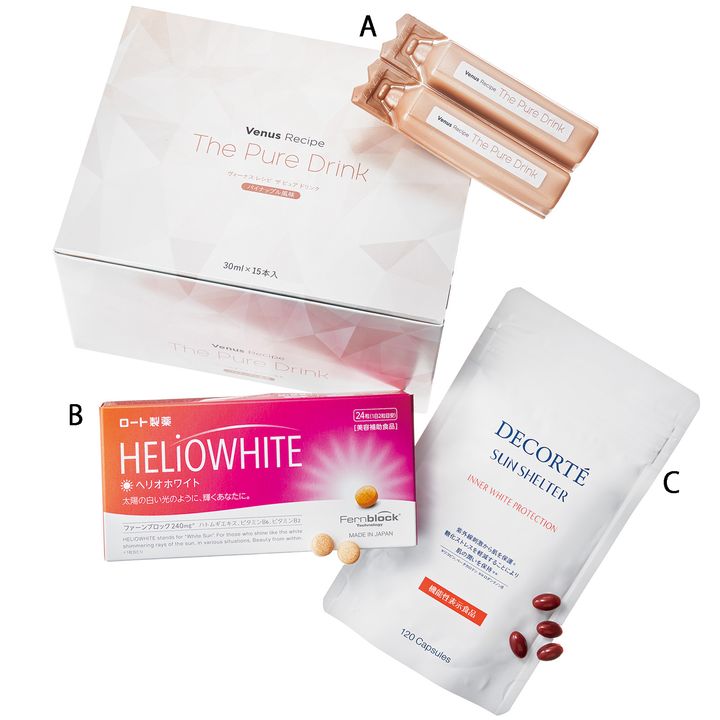 A.美容成分を厳選配合し明るく輝きのある肌に。さわやかで飲みやすいパイナップル風味。持ち運びに便利。ヴィーナスレシピ ザ ピュア ドリンク 450ml(30ml×15本)¥10,584(アクシージア)