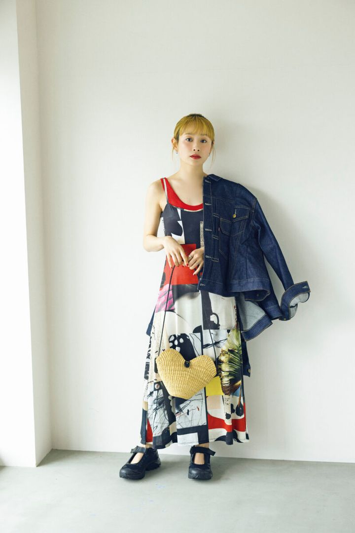 「一枚でさらりと纏うだけで着映えるような、個性が光るアーティスティックな柄ワンピースが主役。インナーに重ねた赤のノースリトップスや肩掛けしたデニムで自分らしくカジュアルさをプラスしました。昨年冬のニットから始まり、今季も引き続き赤が気分。また、ロマンティックなアイテムもこの夏気になっていて、例えば、Tシャツの上にレースのビスチェを重ねたり、定番のカジュアルにガーリーなテイストを加えたりして、夏のお洒落を鮮度高く楽しみたいです。