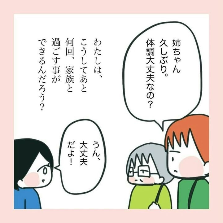 苗さんの夫・父・弟、そして兄夫婦とその子どもとの夕食は、穏やかで幸せな時間が流れます。「まだ死にたくない」という気持ちがこみ上げてきました。