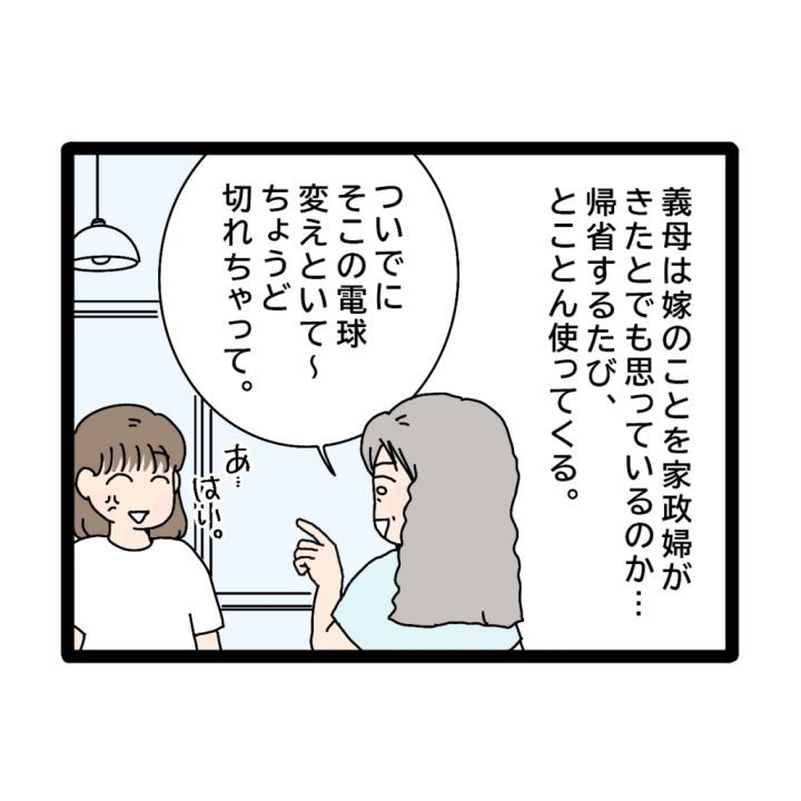 「ついでにそこの電球変えといて~。ちょうど切れちゃって」笑顔でそう言われ、「あ・・はい」と怒りがこみ上げながらも返事をする私。