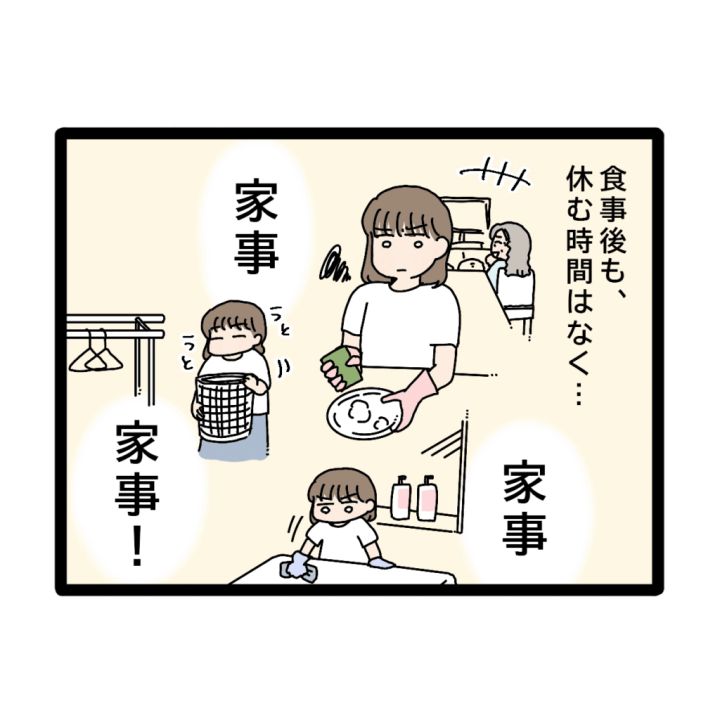 そして食事後も休む時間もなく、食器洗いに掃除に洗濯と家事に追われる私。