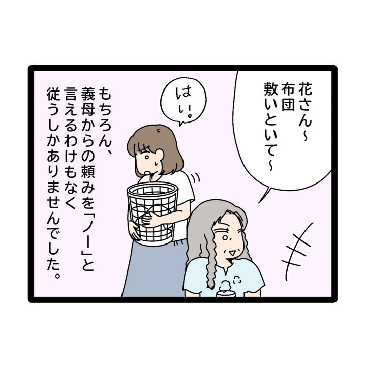 そして、「花さん~、布団敷いといて~」と自分はお茶を淹れ、優雅に休憩。義母からの頼みに「ノー」と言えるわけもなく、「はい」と従うしかありませんでした。
