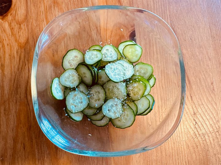 2. きゅうりは、薄い輪切りにして、塩(分量外)でもみ、水分が出るまで置いてからよく絞ります。