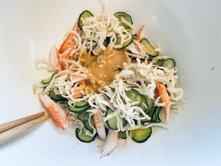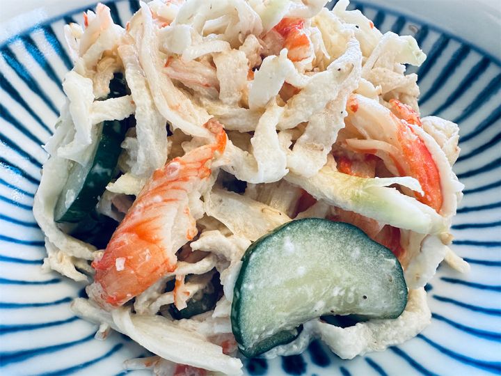 3. ボウルに水気を切った切り干し大根、2のきゅうり、ほぐしたカニ風味かまぼこを入れ、混ぜ合わせた[A]で和えれば完成です。