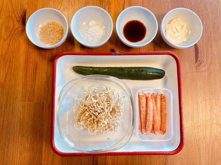 ボウルに水気をしっかり切った切り干し大根、きゅうり、カニ風味かまぼこを入れ、合わせ調味料を加えたらよく混ぜます。