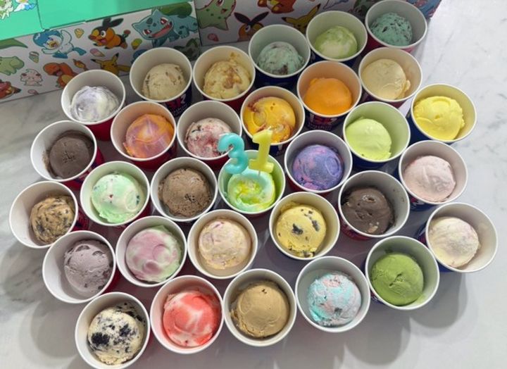 テーブルいっぱいに並んだカップアイスの数は、なんと31個!色とりどりのフレーバーは、見ているだけで気分上がっちゃいますね。子どものときは、ただの夢でしかなかった挑戦が、大人になれば「全部選んで全部自分一人で食べる」という選択肢が解禁されるのです。その自由さと贅沢さこそが、大人の特権なのでしょう。