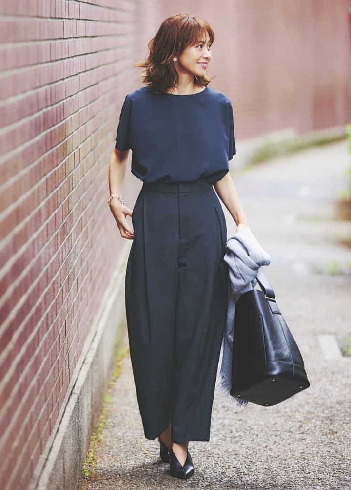 ゆったりとしたシルエットでトレンド感満載のパンツ。着回し力も動きやすさも抜群。清涼感のあるトップスもネイビーで統一して、きちんと感も親しみやすさもUP!小物は、ブラックで揃えてキリッと引き締めて。