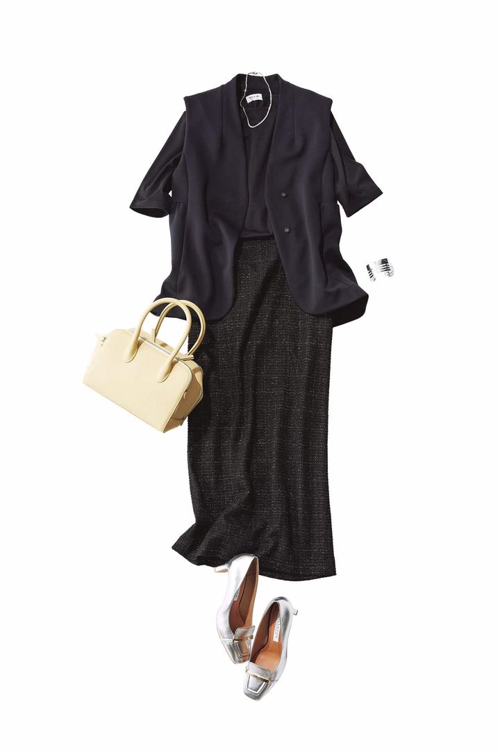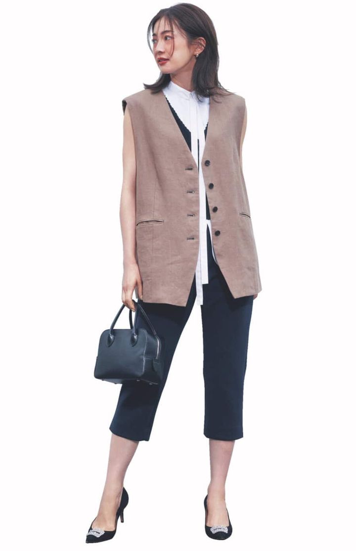 膝下丈の動きやすく涼しげなパンツコーデ。ベージュのジレを組み合わせて、ブラックの面積を狭め、モノトーンコーデにこなれ感を。ブラウスのデザインの抜け感が程良いアクセントに。足元はピンヒールで女性らしくきちんと仕上げたい。