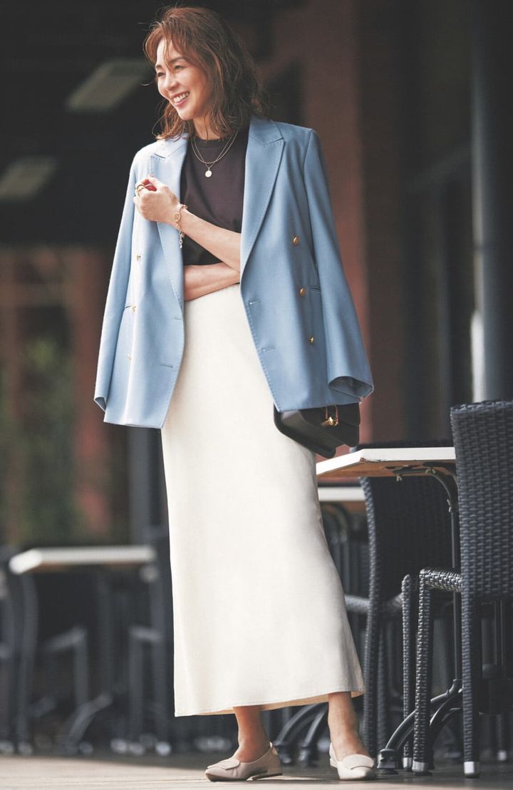 ブラウン×タイトスカート合わせで落ち着いた女性らしいコーデ。着心地抜群な柔らかいブルーのジャケットをプラスして、夏っぽく。トレンド感のある小物やアイテム一つ一つにゴールドを散りばめて、品の良さをアピール。