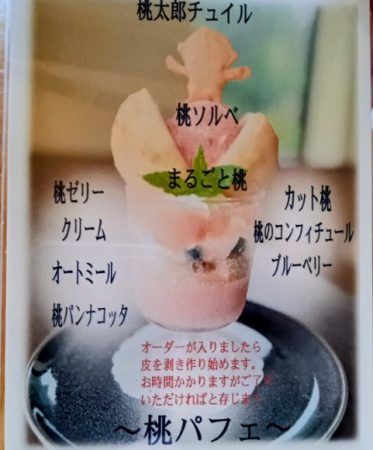 こちらを↑見てください。何と桃太郎がいましたよ‼桃太郎まで表現している桃パフェは初めて‼言われてみれば桃と桃太郎はコンビですよね、今までなかったほうが不思議かもしれません。
