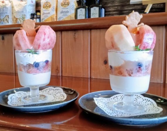 最初に目が行くのはやはり天辺。チュイルで出来ている桃太郎。コルティーレはフードメニューの前菜プレートにチュイルがトッピングされています。チュイルはお得意なんですよね‼パフェにもチュイル。薄くてサクサクの食感に丁度よく胃が動き始めました。