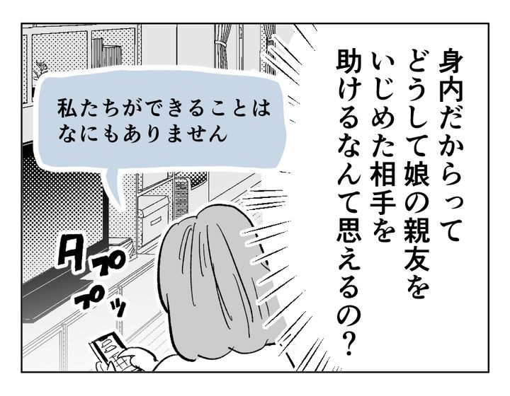 ミヅキさんにはレイナちゃんという高校1年生の娘がいます。レイナちゃんは同い年で幼なじみのサトミちゃんと仲良し。別の高校に通っていますが、放課後待ち合わせをして遊んだりしています。そんな中サトミちゃんが手紙を残し家出をする事件が……。そこでサトミちゃんがいじめを受けているとレイナちゃんから知らされます。その後、疎遠だった旦那マサユキさんの妹カズエ・マキ親子が急に訪問。そこでマキちゃんがいじめの犯人ということが発覚。それでもまだ「あいだを取りもってほしい」というカズエさんはしつこく……。